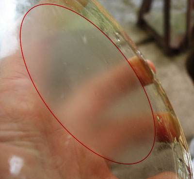 Již po prvním omytí zrcadla uvidíme jak se oblast v jeho středu začíná probrušovat a zpočátku se tato oblast bude velmi rychle rozšiřovat směrem k okrajům plochy. Při každém mycím cyklu uvidíme pokrok. Ten se ovšem bude se zvětšující se broušenou plochou výrazně zpomalovat. Na obrázku je pro lepší viditelnost probroušená část v počítači zvýrazněna červenou čarou. Až bude průměr probroušené plochy větší jak zhruba třetina průměru zrcadla, můžeme pro urychlení procesu při broušení na zrcadlo začít i mírně tlačit. Až se po dalších několika hodinách práce probroušená oblast přiblíží k okraji na 2 - 1 cm, začneme kontrolovat její vystředění. Nejsnáze to provedeme tak, že k okraji zrcadla přiložíme palec a ukazováček, mezi kterými držíme třeba sirku. Její délku nastavíme tak, aby se dotýkala probroušené oblasti. Otáčíme zrcadlem a přikládáme prsty držící sirku z různých stran. Tak jasně uvidíme, jak je plocha vystředěná. Pokud takto zjistíme excentricitu větší než zhruba milimetr, opravíme ji korekčními tahy. Zrcadlo uchopíme tak, aby vybroušená oblast byla co nejblíže k nám (největší okraj směrem od nás) a s tahy vedenými přes střed podložky, ale !!!bez otáčení zrcadlem!!! jednou až dvakrát obejdeme stolek. Poté přeměříme excentricitu a případně postup opakujeme tak dlouho, až se zrcadlo vycentruje.