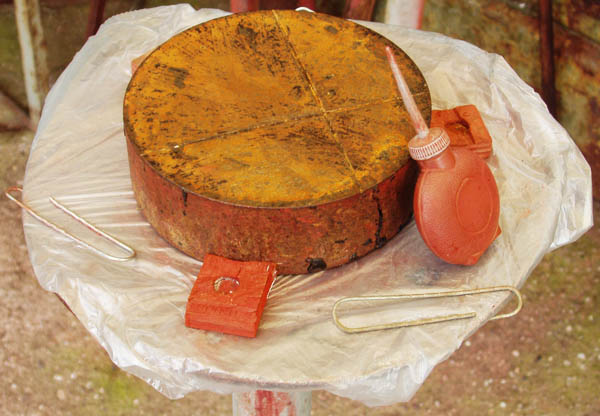 Pohyb se nesnažíme dělat nadmíru pravidelný (např. odpočítávání přesného počtu tahů na jedno obejití stolku atd.), zhruba pravidelnou se snažíme dodržovat pouze délku tahů. Můžeme začít. Na brusnou podložku opatrně nasypeme malé množství brusiva (nejsnáze jemným poklepáváním na lahvičku ukazováčkem, podobně jako bychom si chtěli z lahvičky se solí posolit chleba). Pokud fouká vítr, stojíme přitom zásadně tak, abychom před ním kryli podložku svým tělem, jinak hrozí, že se nám brusivo zbytečně rozfouká po okolí. Zhruba potřebné množství brusiva je vidět na obrázku. Čím k jemnějšímu brusivu budeme časem postupovat, tím menší množství ho budeme sypat.