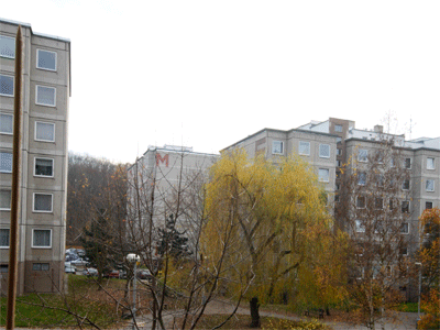 Princip nalezení středu otáčení je velmi jednoduchý. Rozložíme stativ, nasadíme na něj panoramatickou hlavu a na ní upevníme fotoaparát. Pokud pracujeme s objektivem s proměnlivou ohniskovou vzdáleností, nastavíme ji přesně tak, jak bude nastavená při fotografování panoramatu. Střed otáčení se totiž zpravidla pro různě nastavené ohniskové vzdálenosti liší. Stativ umístíme někam, kde máme v blízkosti a v dálce k dispozici nějaké svislé linie, které můžeme dát do zákrytu. Třeba nějakou tyčku poblíž a pouliční lampu v dálce. Čím je poměr vzdáleností obou linií větší, tím přesnější bude nastavení. Já osobně vidím z balkónu panelák, takže to řeším tak, že na zábradlí do kousku modelíny (lze použít i žvýkačku :-) zapíchnu špejli tak, abych jí v hledáčku viděl v zákrytu s hranou onoho paneláku viz obrázek. Pro představu vzdálenost špejle od objektivu je cca 30cm a vzdálenost hrany toho paneláku je cca 30m. To je víc než skvělý poměr, v praxi stačí i hrubší nastavení s daleko menším poměrem vzdáleností (třeba 1m a 10m).