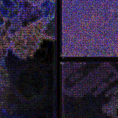 Ale my je umíme zesílit! Naprosto nesmyslně, ale chtěli jste je vidět, tak se na ně pojďme podívat. Jak se to udělá? Vezme se nástroj křivky a prudce se zvýší strmost křivek výsledného obrázku. Ve svém testu jsem hodnotu koncového bodu 255 posunul na 15, tedy jsem jakoby zvýšil citlivost filmu o 4 EV (to je trochu složitější vysvětlování a výpočet). Konečně rozdíly uvidíme! Ale takto se samozřejmě nikdy na normální fotku nedíváme, takže to berte jen pro zajímavost. Mimochodem krásně vidíte, co je pro JPG algoritmus těžké nebo naopak snadné komprimovat. Ještě pro srovnání, aby bylo vidět, jak moc je chyba zesílena, jsem stejným postupem zesílil šum digitální zrcadlovky při ISO 1600 (vyfotil jsem na 1/50s zavřenou krytku objektivu, takže tmu, aby ten krásný šum nic nerušilo).