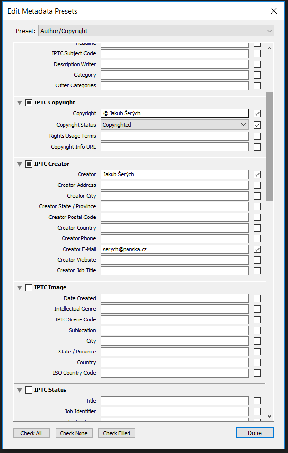 - Takových presetů si můžete udělat několik (například pokud chcete na fotkách pro různé účely mít jiné informace o copyrightu)