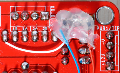 Nejvhodnější místo pro LED diodu jsem našel ve druhém rohu desky než je umístěna LED dioda indikující napájení, tedy poblíž dvou tranzistorů pro spínání topných těles (viz první obrázek). Dioda má rozteč vývodů cca 2,5 mm, je tedy potřeba vyvrtat tři dírky vrtákem 0,8mm s touto roztečí. Na horní straně desky je v tom místě souvislá vrstva mědi (se zemí), zatímco na spodní je dělící čára oddělující pás mědi u okraje desky na kterém je zem od plochy více ke středu desky, kde je vyvedeno napětí pro motory (obvykle +12V). Rozhodl jsem se udělat díry pro LED právě v této části, cca 1mm pod dělící čárou. Doporučuji nejprve místa děr naznačit na spodní straně tenkou lihovou fixou, a pak vyvrtat. Ani na horní ani na spodní straně desky se vývody diody nesmí dotýkat původních měděných plošek. Na horní straně jsem proto opatrně vrtáčkem 2 mm udělal jakési zapuštění (jako se dělá pro zápustné šrouby), které odbrousilo měděnou vrstvičku do bezpečné vzdálenosti od nožiček diody (je to trošku vidět na prvním obrázku). Pro úpravu spodní strany jsem vzal lámací skalpel a asi 1mm pod dírkami a 1mm na každé straně od nich prořízl měď ve tvaru malého obdélníčku (cca 7 x 3 mm), a ten pak ještě rozparceloval mezi budoucími třemi vývody LED diody. Pro každý vývod tak budeme mít samostatný ostrůvek ve tvaru zhruba čtverečku 2 x 2 mm. Pokud máme desku z profi výroby, je opatřena nepájivým lakem, proto je třeba nakonec čtverečky opatrně oškrábat skalpelem na čistou měď. Pečlivě pod lupou zkontrolujeme, zda jsou proškrábnutí dostatečná a zda se nám někde nezatoulala nějaká hoblinka mědi, která by plošky mezi sebou zkratovala. Pak můžeme diodu připájet (je jedno, jak ji orientujeme). K prostřední plošce připájíme tenký drátek, který na druhém konci vede k nejbližšímu místu s +5V (viz bílý drátek na druhém obrázku). Ke dvěma krajním ploškám opatrně připájíme jedním koncem SMD rezistory tak, aby jejich druhý konec čouhal do vzduchu. Následně na tyto druhé konce připájíme tenké drátky (v mém případě modrý a červený). Zapneme napájení desky a druhými konci těchto drátků se někde dotkneme země a vyzkoušíme, který patří zelené a který červené diodě (já jsem to vyzkoušel předem a rovnou jsem si červený drátek připájel k červené diodě a modrý (nemaje zelený) k zelené. Ale vpodstatě je to jedno, ovlivníte tím jen to který směr komunikace bude svítit jakou barvou.