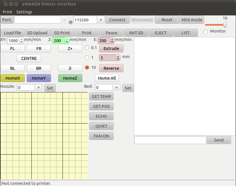 Jako software na ovládací počítač v této fázi doporučuji Printrun, což je skupina několika užitečných prográmků psaných v jazyce python. Proto bude nejprve potřeba podle README v Printrunu nainstalovat Python, pyserial a wxPython. Pak si stáhneme a rozbalíme Printrun a spustíme nejužitečnější utiitku nazvanou pronterface. Vypadá následovně: