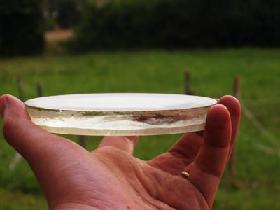 Tato fazetka je nezbytně nutná na straně plochy zrcadla, ale je vhodné si ji udělat i na druhé straně kotouče. Ocení to Vaše ruce, kterými budete několik desítek hodin kotoučem pohybovat. Zejména když se kůže na prstech namočí, změkne a je nebezpečí pořezání se o neopracovanou hranu skla. Zkontrolujeme, zda je brusný stolek stabilní a případně jeho nohy zatížíme kameny. Překryjeme ho mikrotenovým sáčkem, který pomáhá udržet čistotu na pracovišti nutnou zejména později u jemnějších brusiv. Sáček je dobré přichytit ke stolku třeba několika kancelářskými maxisvorkami. Na sáček položíme brusnou podložku a zafixujeme ji špalíky se šrouby prostrčenými skrz drážky ve stolku. Také naplníme vodou kapátko (na kurzu se jako kapátko osvědčila obyčejná olejnička na kolo). Než přistoupíme k vlastnímu broušení, popíšeme si normální brusný pohyb. Ten se skládá ze tří základních pohybů. Posuvný pohyb vedeme od sebe a k sobě přes střed brusné podložky a měl by mít délku přibližně třetiny poloměru zrcadla. U 12 cm zrcadla tedy asi 4 cm, to znamená přesah 2 cm vpředu i vzadu. Současně s tímto pohybem zrcadlem i mírně pootočíme tak, abychom příští tah provedli na zrcadle pod jiným úhlem. Kdybychom stáli na místě a takto brousili, začala by se nám probrušovat podložka směrem k válcovitému tvaru. Proto musíme při broušení zároveň stále stolek obcházet. Stolek obcházíme ve stejném směru, jakým pootáčíme zrcadlem. Jedno obejití stolku znamená několik desítek tahů a několikeré otočení zrcadlem o 360°.