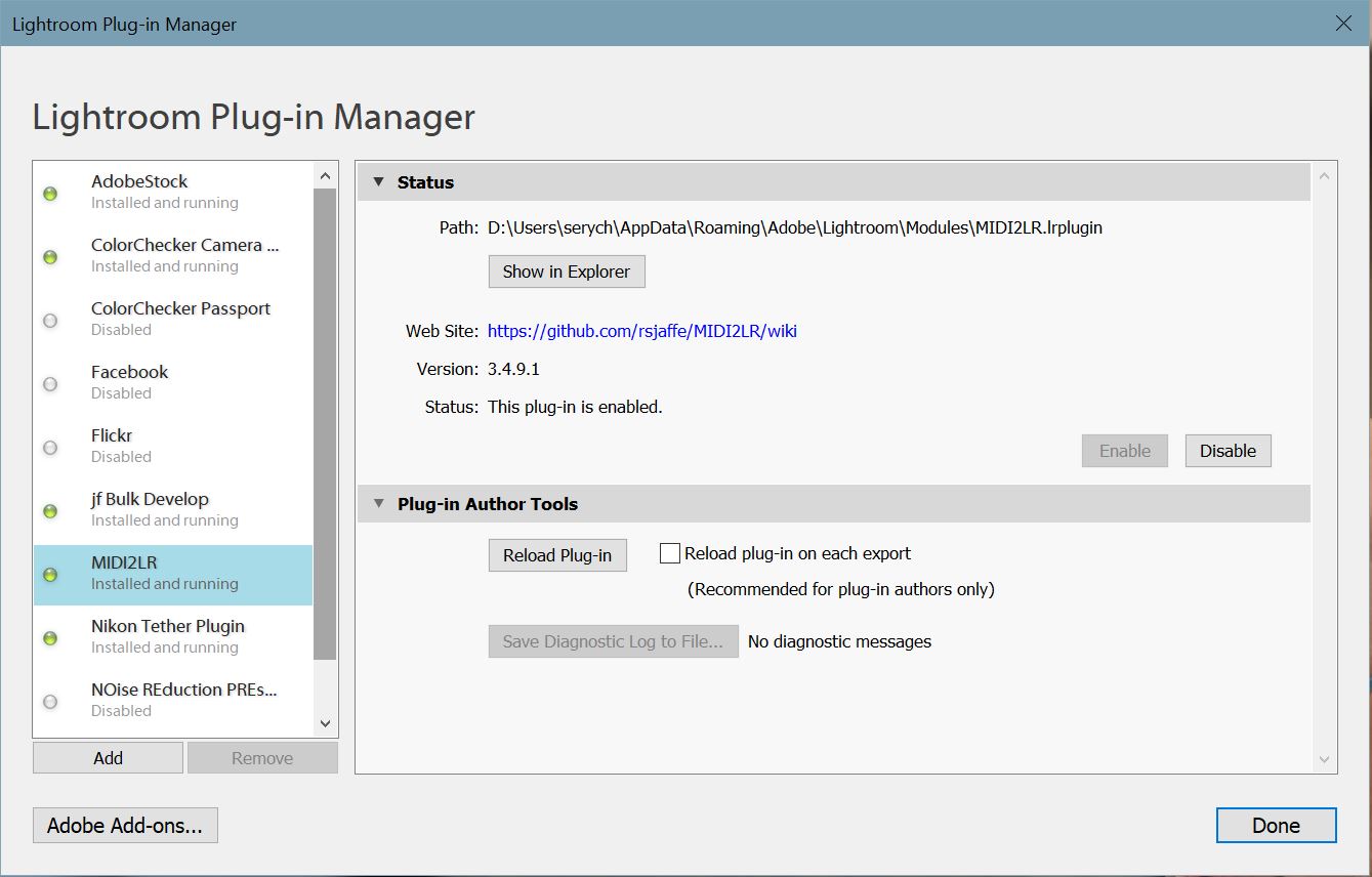 Pokud se okno neobjeví, je potřeba v Lightroomu jít do menu File > Plugin Manager... a plugin tam tlačítkem Enable povolit. Zároveň tam v první řádce sekce Status vidíme, do jakého adresáře se plugin nainstaloval.