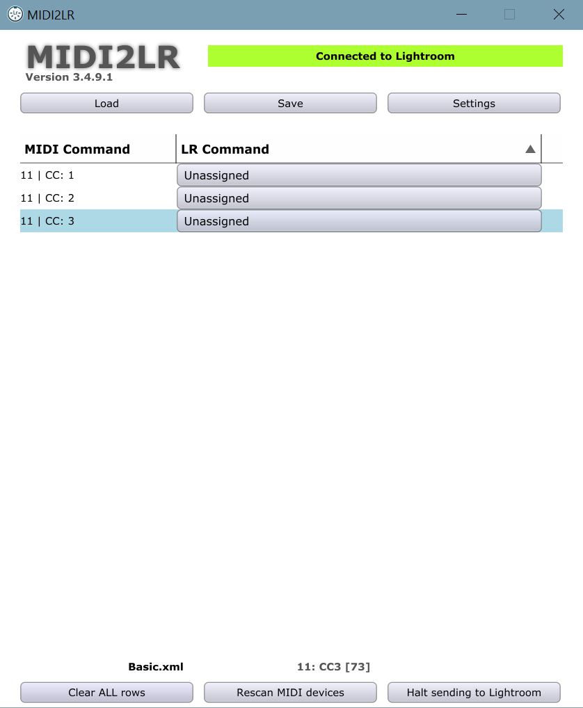 Vypneme Lightroom, připojíme USB kabelem MIDI kontroler, Lightroom opět spustíme a můžeme začít experimentovat. Po instalaci je panel pluginu prázdný jako na obrázku výše. Stačí ale pohnout jakýmkoliv ovládacím prvkem na kontroléru a v okně se objeví vždy nová řádka s tlačítkem Unassigned. Na pořadí, v jakém ovládacími prvky hýbeme vůbec nezáleží, jde jen o to si do panelu přidat příslušné řádky. Například takhle by to mělo vypadat, když otočíme prvními třemi kolečky na kontroléru.