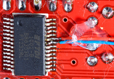 Konečně můžeme druhé konce drátků připojit k nožičkám 23 a 22 obvodu FT232 (viz třetí obrázek) a vše zajistit několika bloby lepidla z tavné pistole. Je to celé docela piplačka, ale s lupou a trochou trpělivosti to určitě zvládnete!