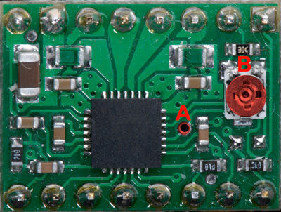 Vezměte voltmetr, jeho zemnící hrot připojte na hlavní desce na kteroukoliv zem (používám pro to šroubek svorky pro připojení zemní svorky silového napájení), a druhým hrotem se opatrně, abyste něco nezkratovali, dotkněte titěrného měřícího bodu na Pololu destičce (na obrázku jsem ho označil A). Trimrem (označeným B) otáčejte tak dlouho, až naměříte cca 0,25 až 0,3V. Napětí 0,4V by mělo odpovídat proudu do motoru 0,5A (našel jsem kdesi na Internetu), takže pro naše pokusy s volným motorem by mělo 0,25 až 0,3V na měřícím bodu a tomu odpovídající nižší proud rozhodně stačit. Pokud by se později zdálo, že motor při tomto proudu neutáhne tiskármu, je možné ho seřídit na vyšší hodnotu, ale pro první pokusy i s ohledem možnosti dojetí motoru na dorazy doporučuji raději hodně nízké hodnoty, a tím i malý kroutící moment motoru.