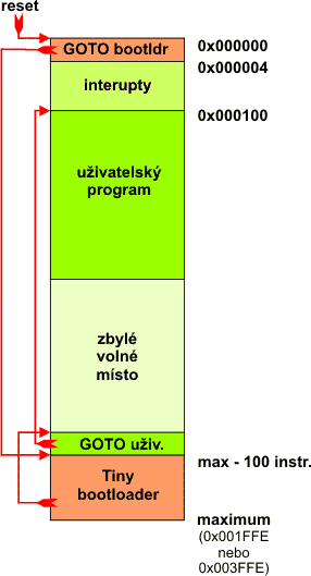 Dobrá, bootloader tedy leží na konci paměti programu. Ale jak ho tam spustit? Jedinou možností, jak v procesorech dsPIC spustit po resetu program je umístit na adresu 0x000000 instrukci GOTO <adresa jeho začátku>. Tím tedy máme zajištěno spuštění bootloaderu po resetu procesoru PIC.